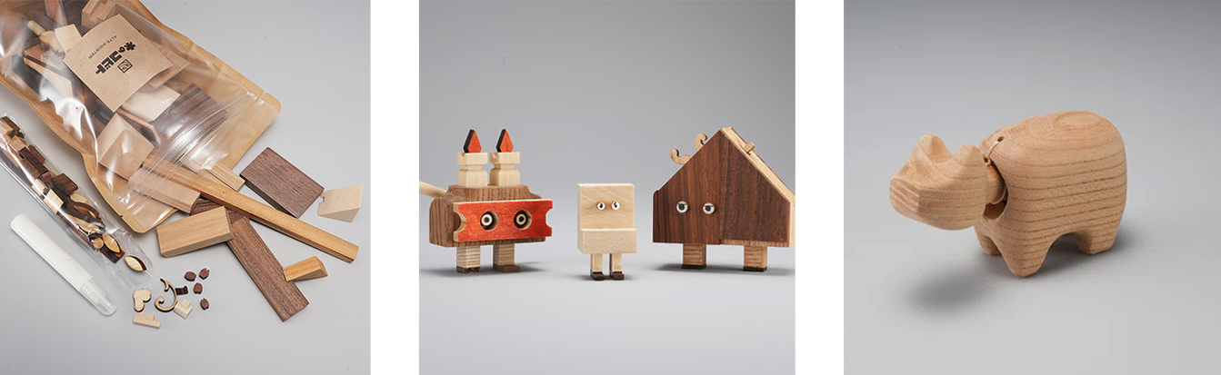 弊社からは、オリジナルの工作キット『木のコビトセット』や『木の赤べこ』を中心に、皆様に木の良さを伝える製品をご準備いたします。